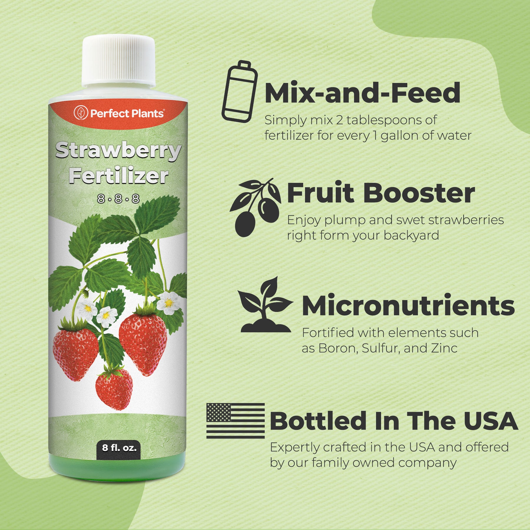 Packaged in a convenient 8 fl oz bottle, this best fertilizer for strawberries is easy to store in a cool, dry location out of direct sunlight. Proudly made in the USA by a family-run business, Liquid Strawberry Fertilizer reflects our commitment to quality and dependable garden care. Whether you’re growing strawberries in garden beds, containers, or raised planters, this versatile formula supports healthy plants and rewarding harvests.