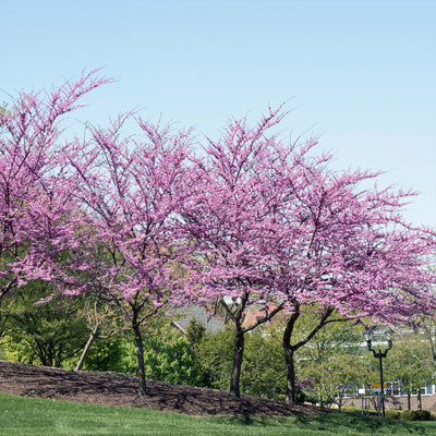 Larger purple trees can make an impressive accent on your property. Whether standing stately and prominent in the front yard, flanking your mailbox, or guarding the ends of your porch or patio, purple trees are a statement. A huge flowering redbud in your yard will be the star of the neighborhood.